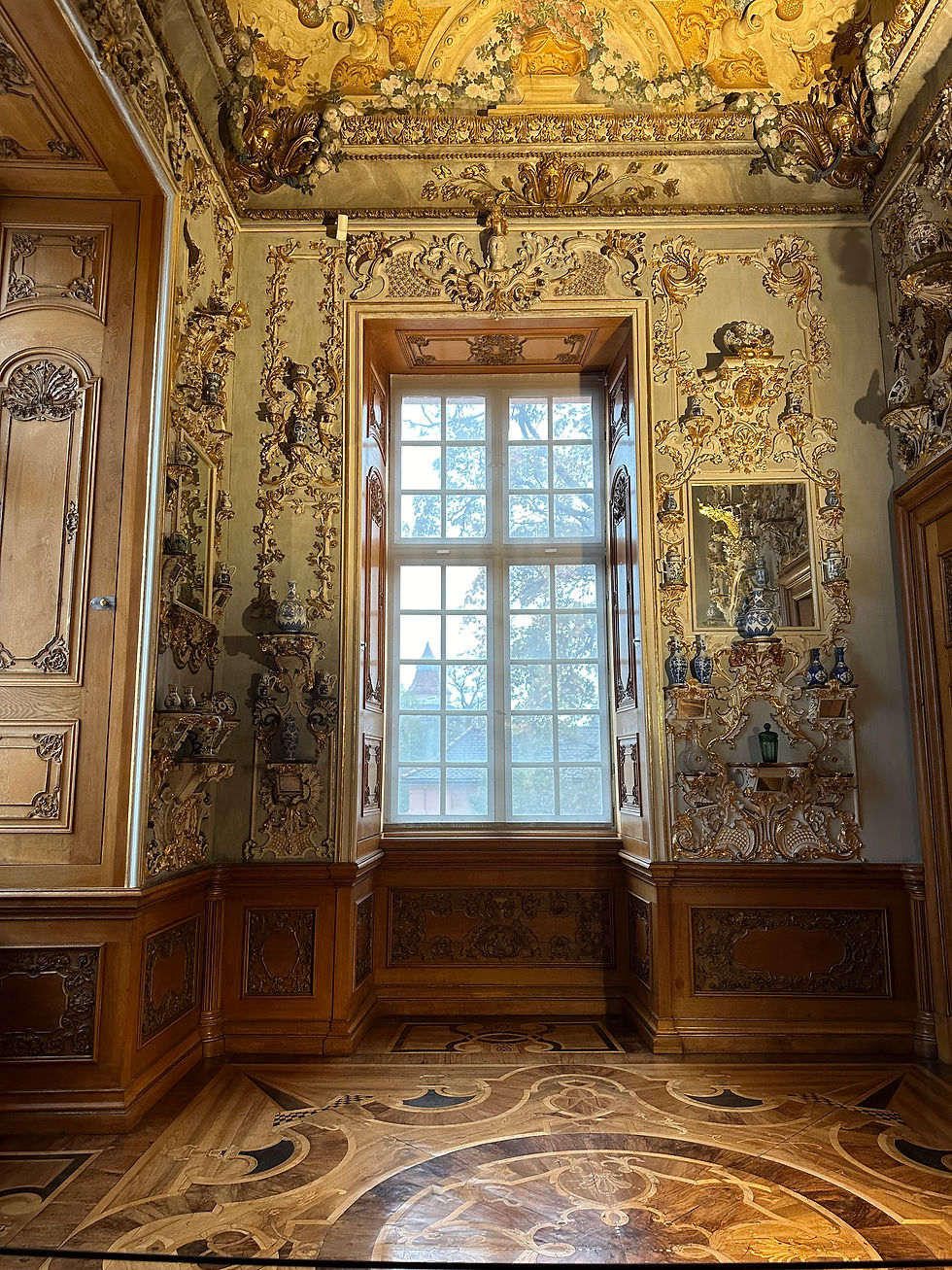 Yesterday was a rainy day adventure to Rastatt, Germany for a tour of the Schloss Rastatt Castle. We got a private tour in English, mind you, and it was amazing. We learned all about the Family History and it was quite interesting. We took an hour long train ride from Freiburg and we arrived it was raining, but that didn’t stop our fun. We were greeted with the big salmon colored castle and were excited.